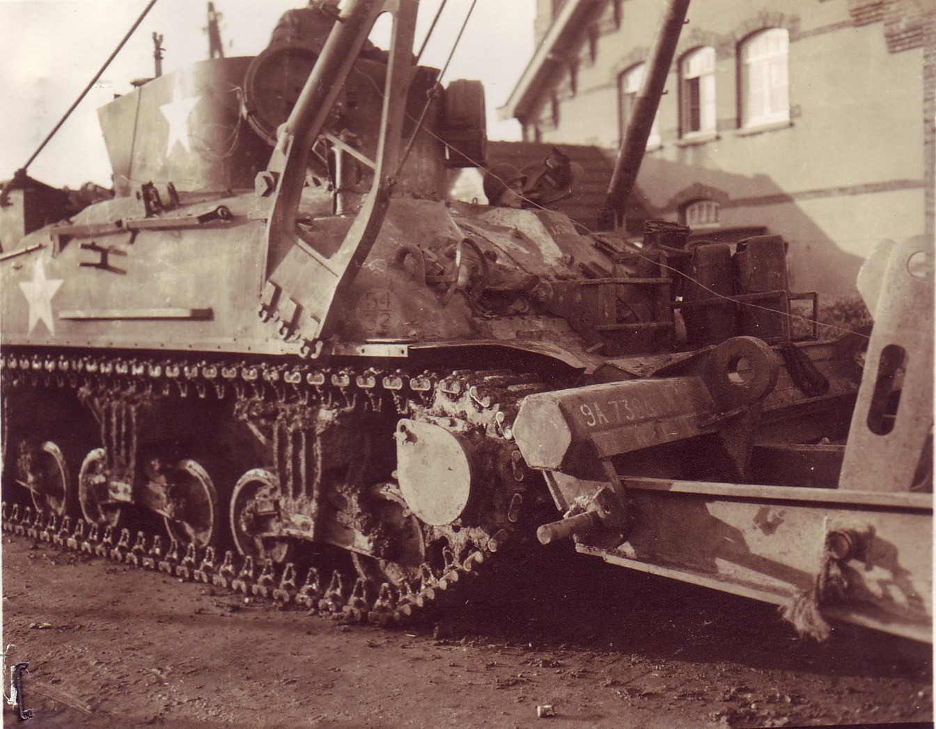 Section of treadway bridge raised into position on front of tank.